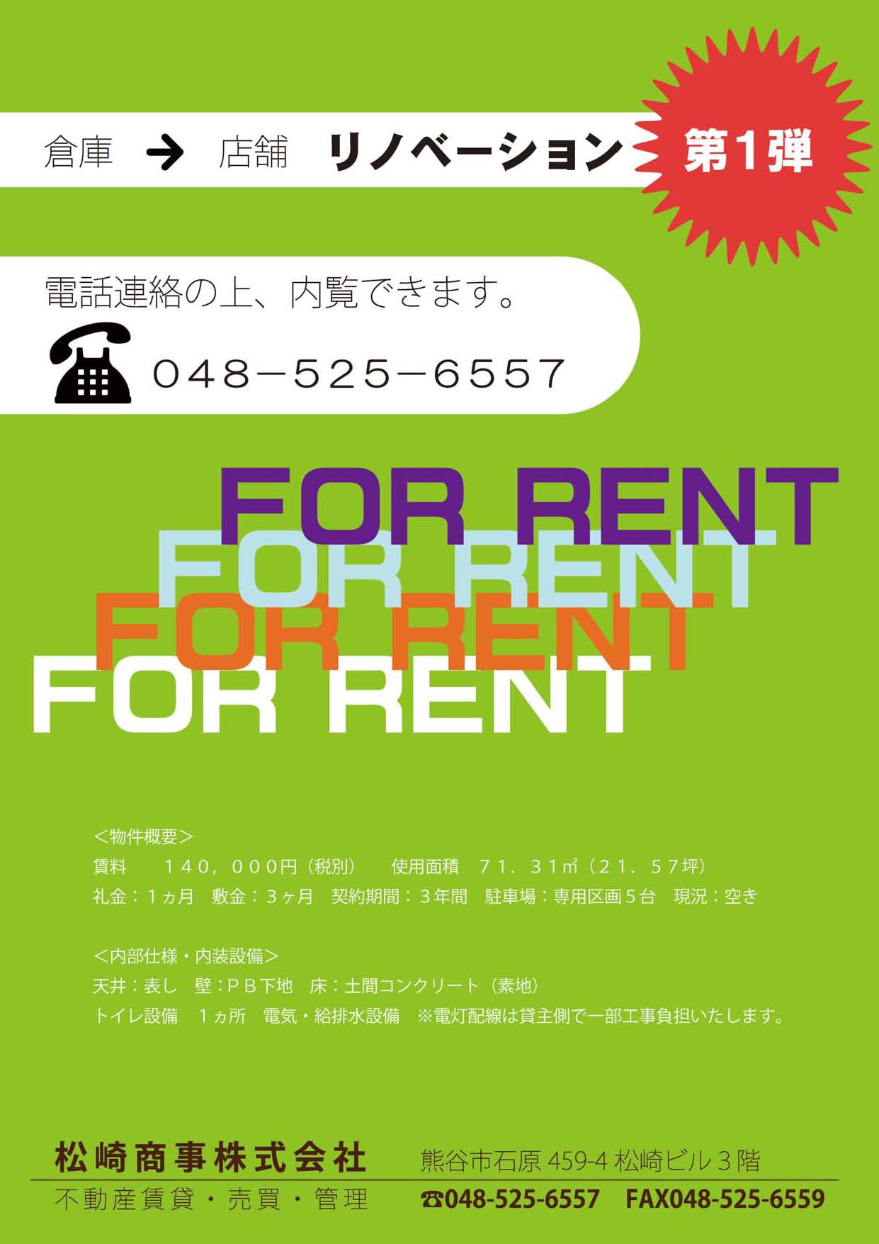 当社で管理している物件がリノベーションして生まれ変わります。 倉庫で利用していた物件も昨今は、なかなか倉庫として借りる人が少ない為、「国道に面して、間口が広い」という立地条件を いかして店舗としてリニューアルしてみました。 現在工事進行中ですが、内覧は出来ますので是非ご覧になってみて下さい。